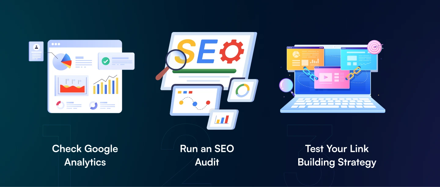 You can use a free SEO checker tool like Moz, or the Search Console tool from Google Webmasters to run a quick diagnostics. Apart from the information you receive in Google Analytics, these tools can provide further details regarding broken links, site speed, if a specific keyword is generating any results, and more.